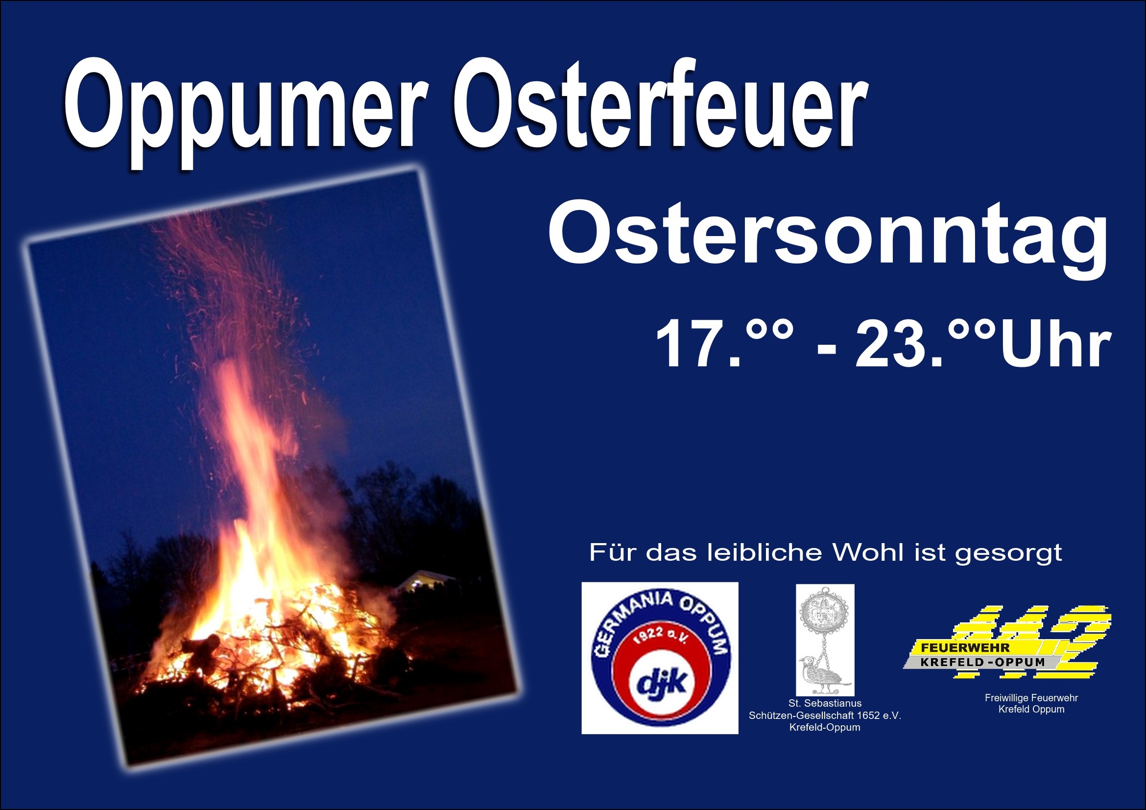 Endlich ist es wieder soweit. Die Tage werden länger, der Frühling steht vor der Tür und somit auch das alljährliche Osterfeuer, ausgerichtet von der freiwilligen Feuerwehr Oppum, der St. Sebastianus Schützengesellschaft und der DJK Germania Oppum. Was Jung und Alt in den letzten Jahren in Scharen an den Festplatz in Oppum trieb, soll auch in diesem Jahr wieder ein großer Spaß für alle sein. Aus diesem Grund wird am Ostersonntag (5.4.) ab 17 Uhr das Osterfeuer entzündet. Zu den gewöhnlichen Kaltgetränken und Grillspeisen, laden Kaffee und Waffeln zum nachmittäglichen Verweilen ein. Die drei veranstaltenden Institutionen haben sich bewusst für einen frühen Start entschieden, um besonders Familien anzusprechen und auch den jüngeren Besuchern gerecht zu werden.